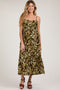 A floral maternity dress with a smocked bodice, a v-neckline, short sleeves, cinched ruffle accent shoulders, and a ruffle accent at the waist. Skirt is lined.