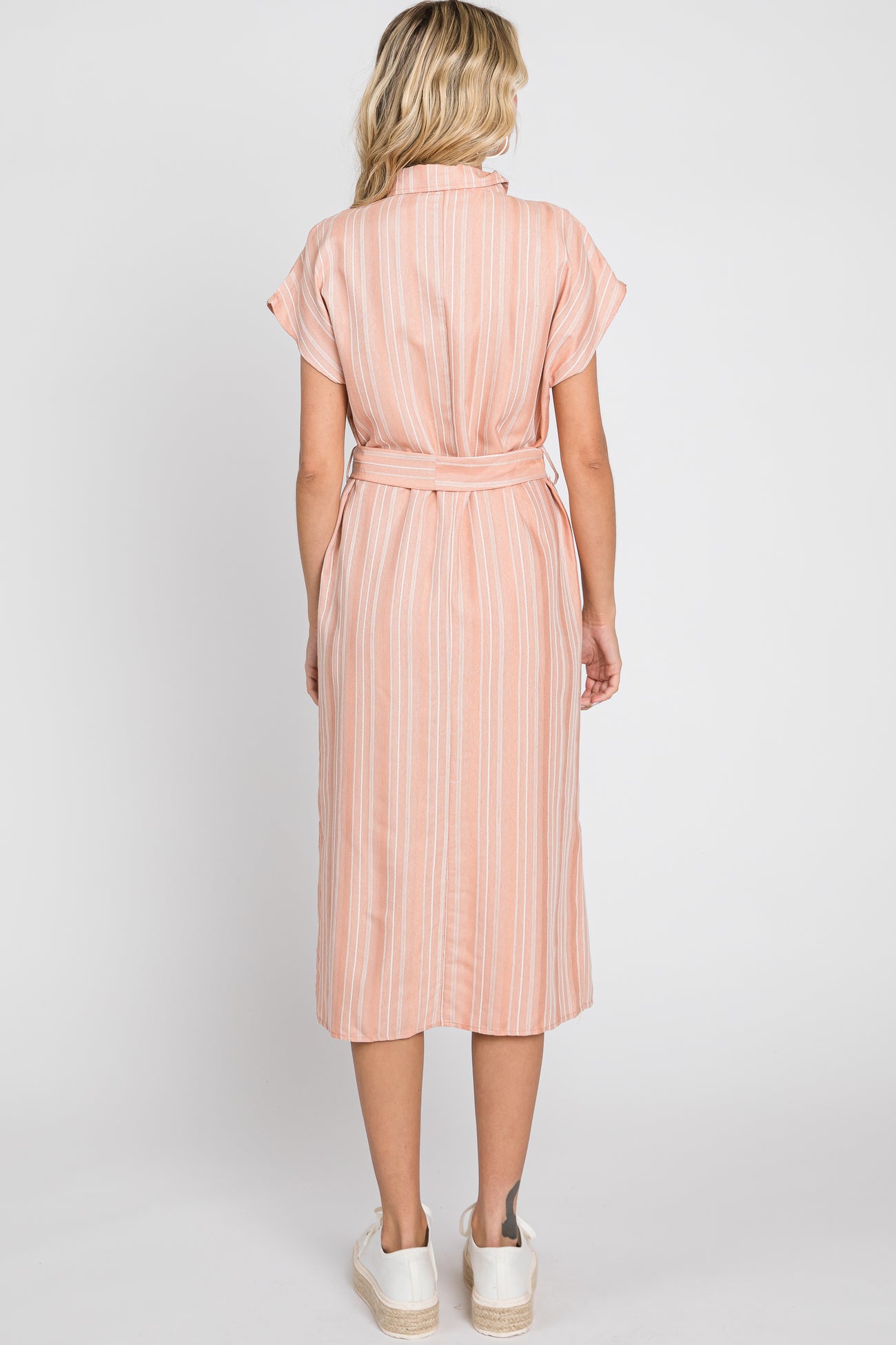 A linen dress featuring a collared neckline, a button front, an adjustable belted tie at the waist, short sleeves and textured stripes.
