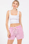 A pair of washed denim shorts featuring side pockets and an elastic waistband.
