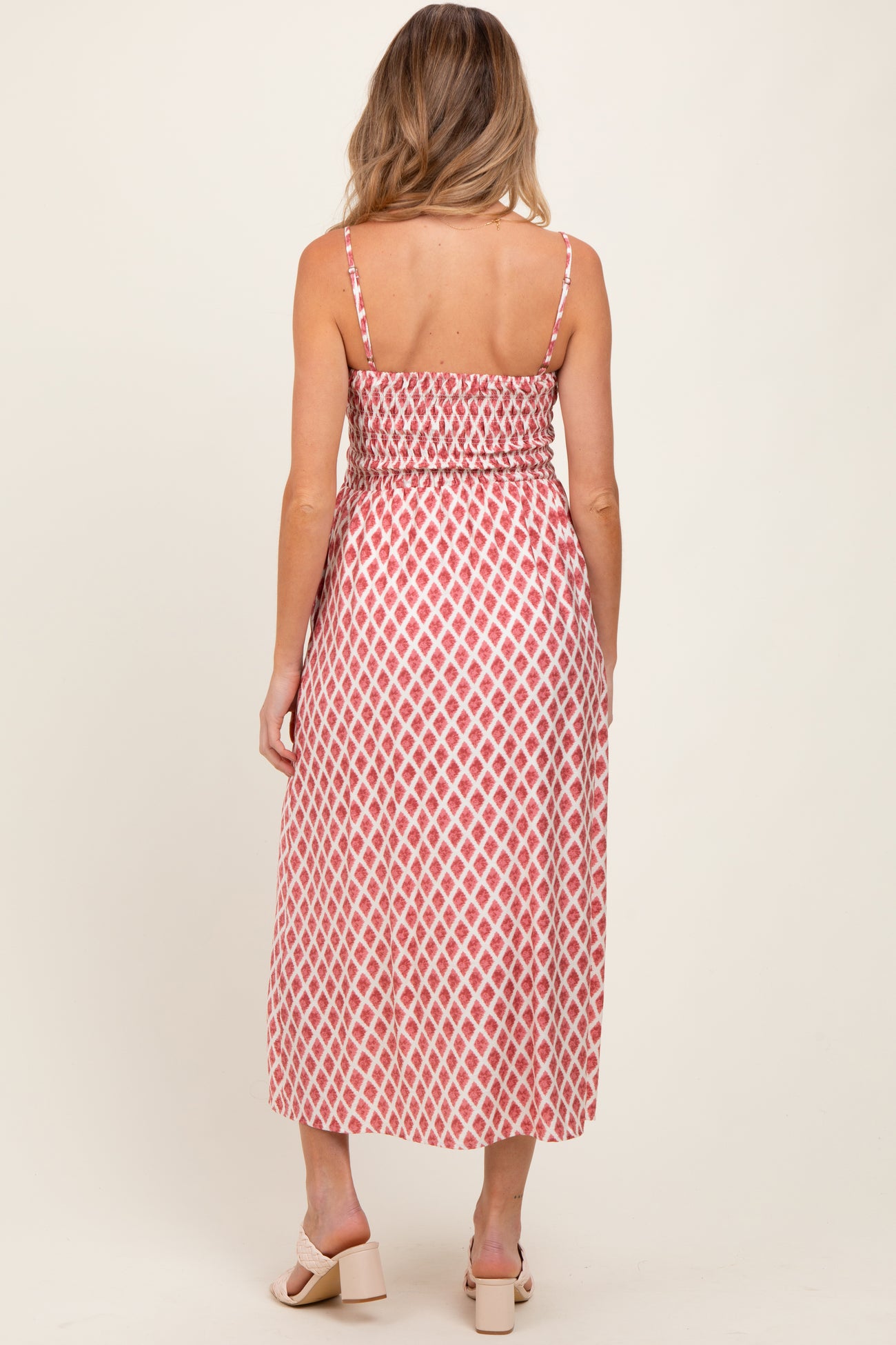 Pink Diamond Print Smocked Maternity Midi Dress