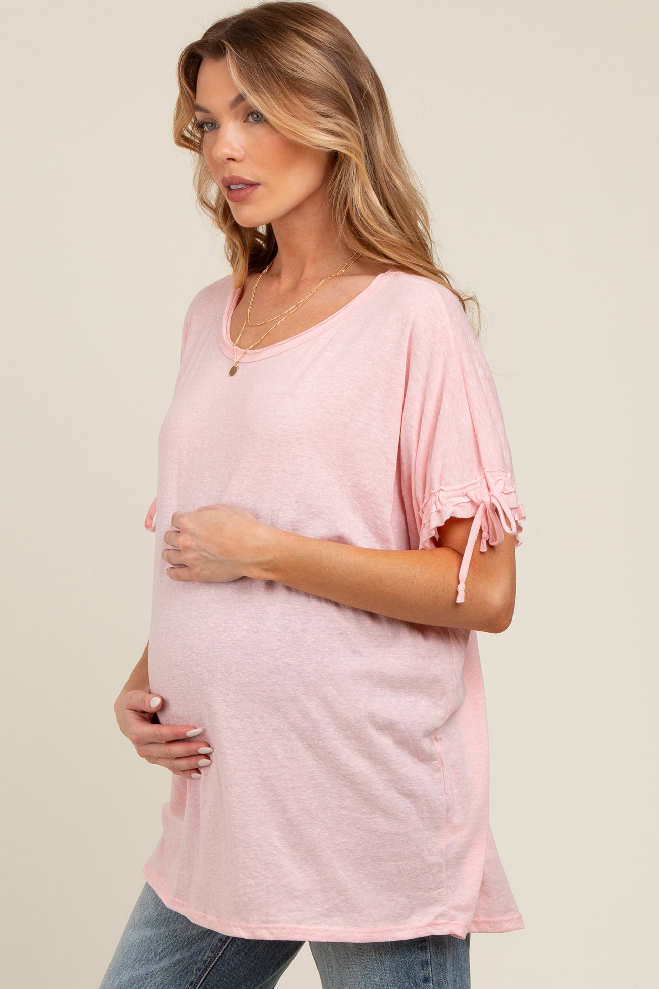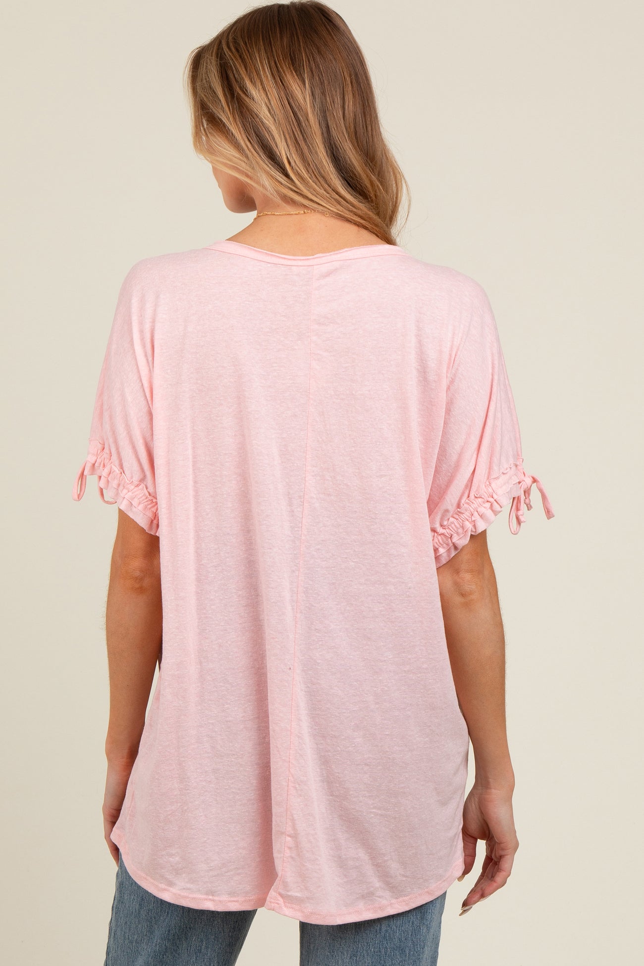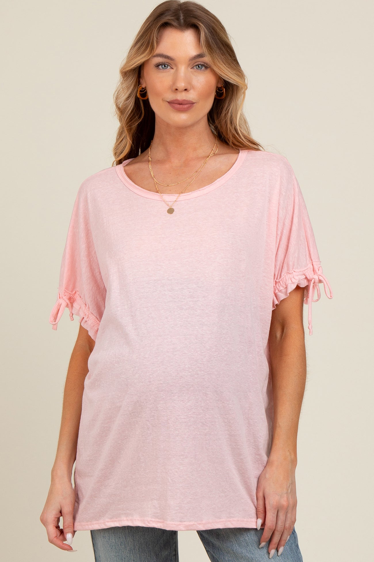 An ultra-soft knit maternity top featuring a rounded neckline and short dolman sleeves with adjustable drawstring ties.