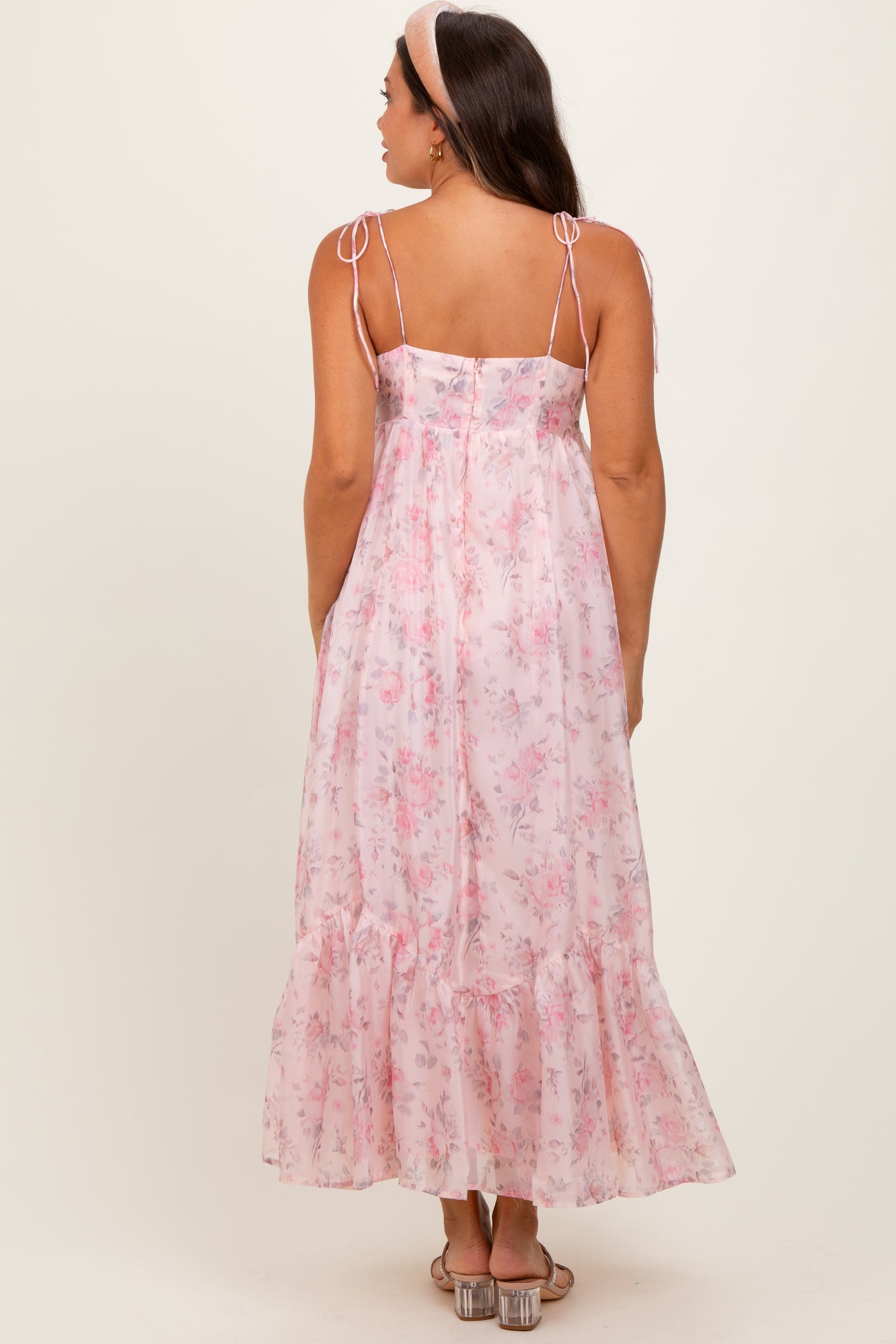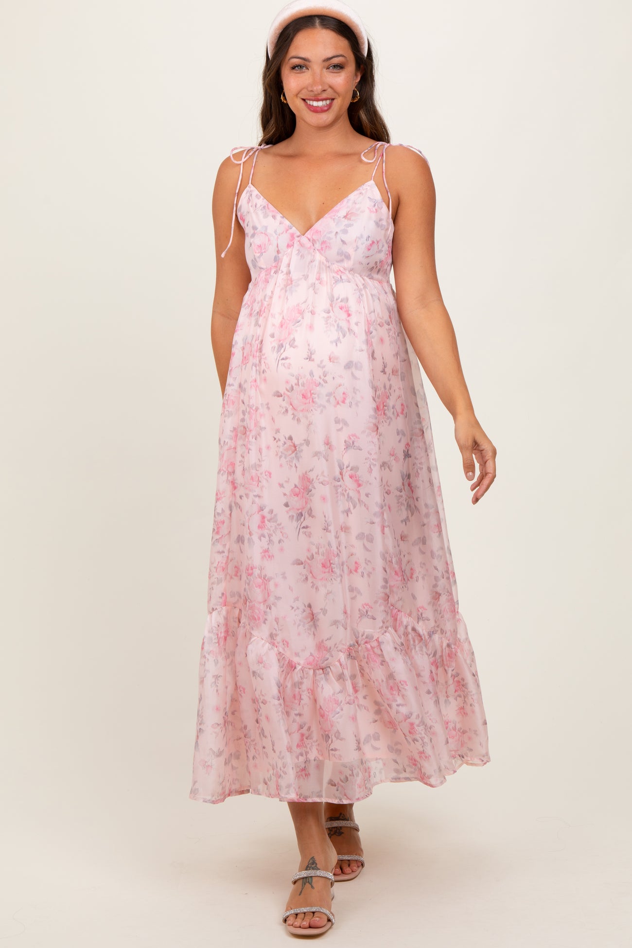 Pink Floral Satin Ruffle Hem Maternity Maxi Dress