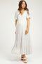 A lightweight midi dress with a squared neckline, long puff sleeves, a back zipper closure, and a gathered bottom tier.