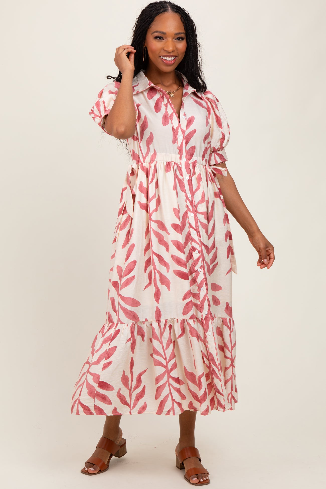 Pink Leaf Print Scallop Trim Midi Shirt Dress