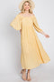A leaf printed midi dress featuring a rounded neckline, ruffle shoulders, a smocked elastic front, a keyhole back cutout with a button closure, an empire waist and a ruffle hem.