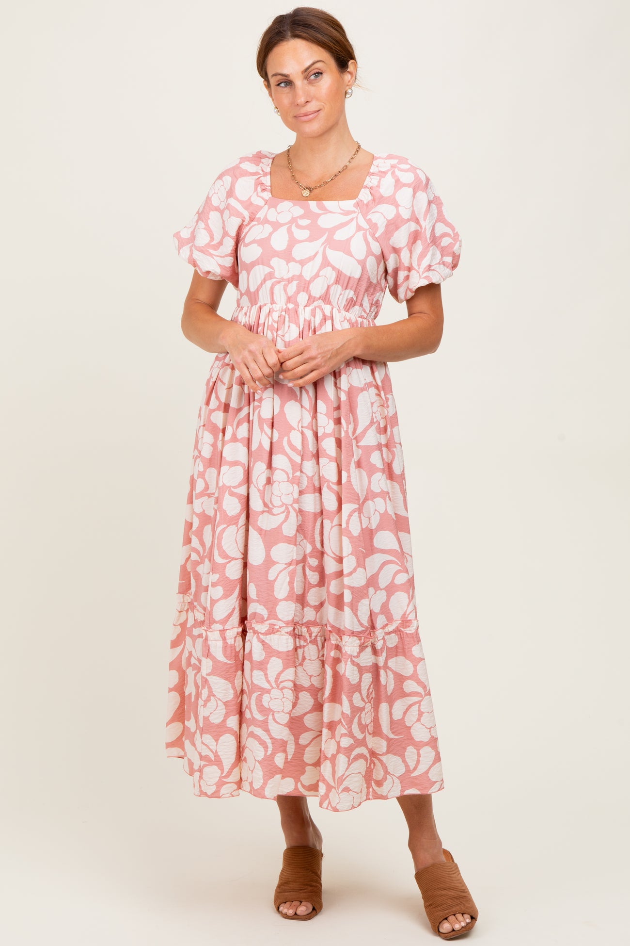 Pink Printed Square Neck Bubble Sleeve Maternity Maxi Dress