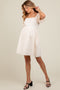 A textured maternity mini dress featuring short bubble sleeves, side pockets, back smocking and a square neckline. Skirt is double lined.