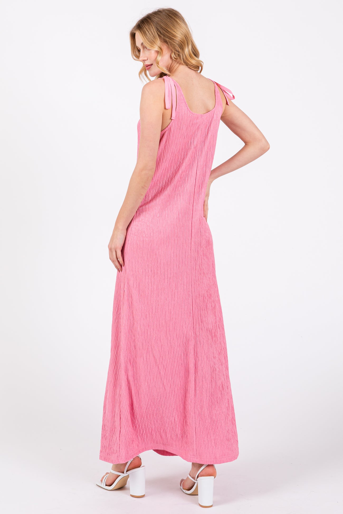 Details A solid midi dress in a textured material with tie strap detail. Content + Care