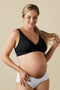 A pair of seamless maternity active leggings featuring textured accents and an elastic bellyband. Material has high stretch.