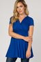 A draped front top featuring a v-neckline, short sleeves, and cinching under bust.