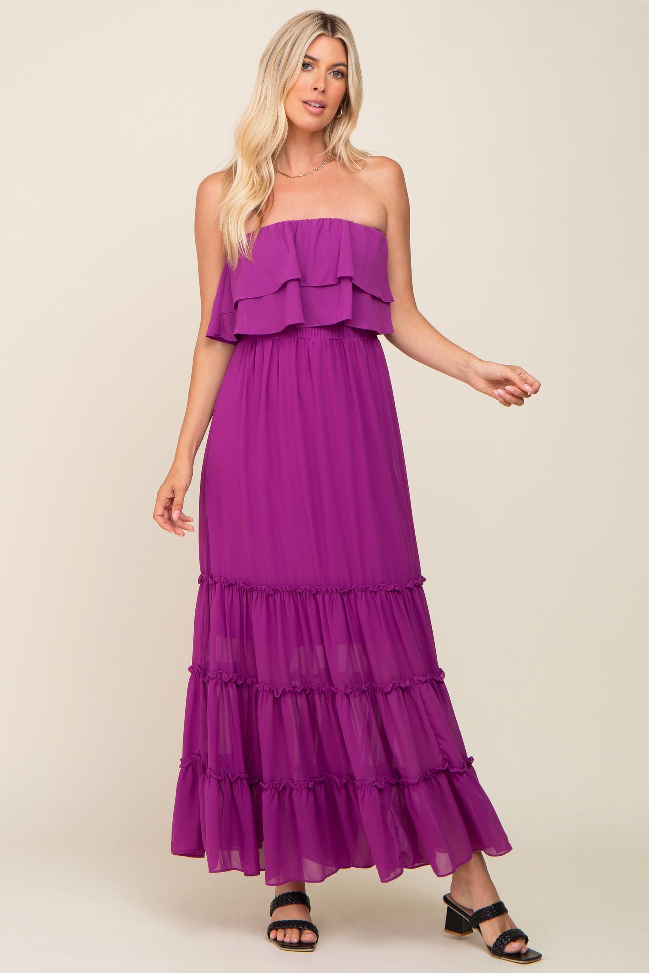 Purple Chiffon Strapless Ruffle Tiered Maxi Dress