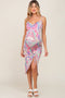 A printed midi dress featuring a cowl neckline, adjustable ties at the shoulders, a front adjustable drawstring with a slit.