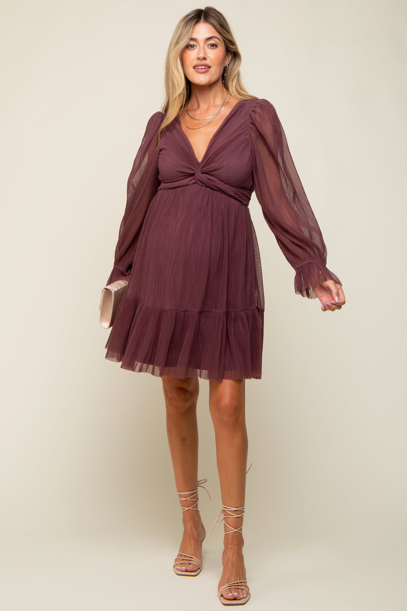 Purple Pleated Knotted Long Sleeve Maternity Dress
