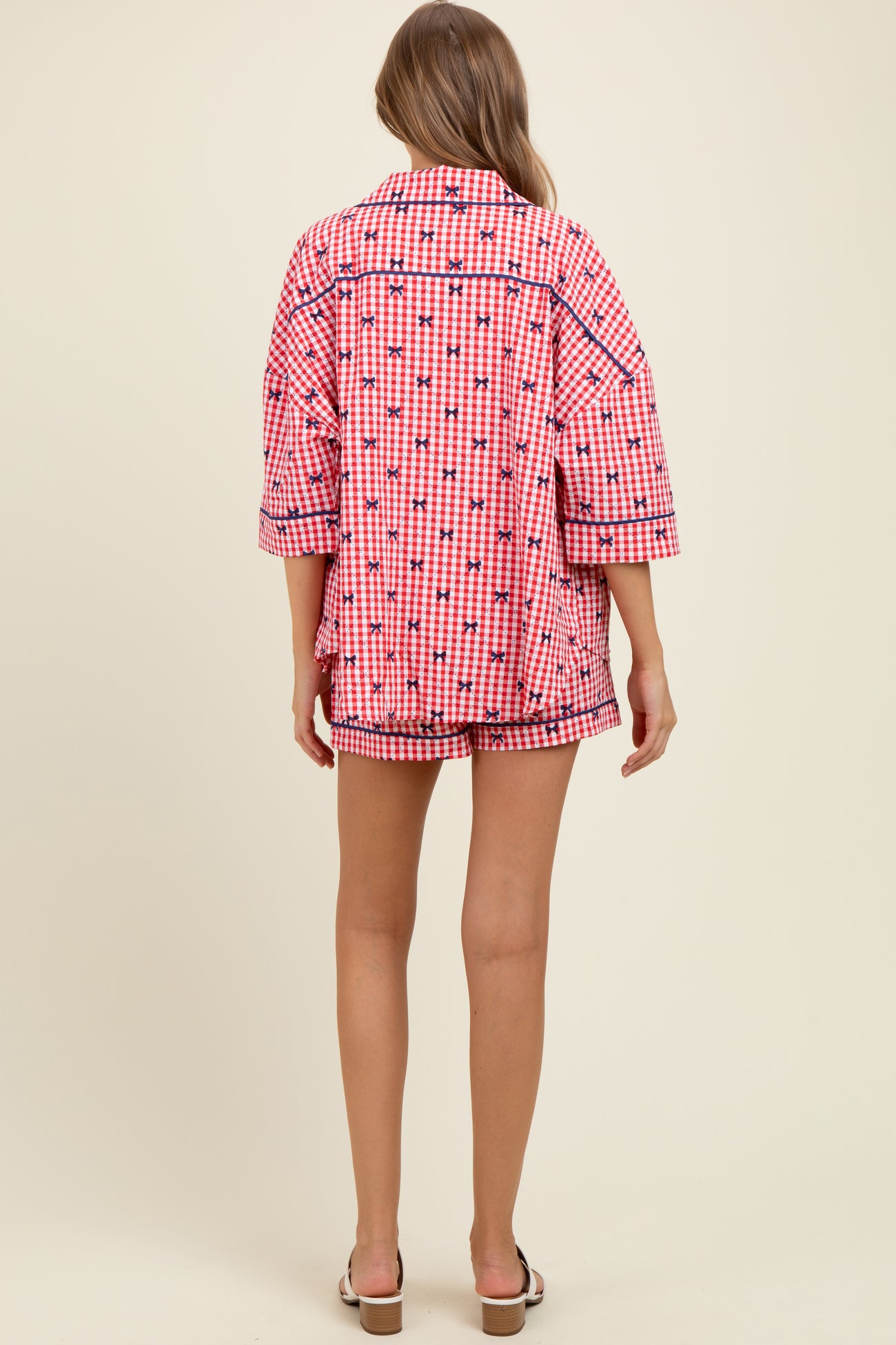 Experience ultimate comfort and style with this Gingham Pajama Short Maternity Set, perfect for lounging or bedtime. Crafted from soft, breathable fabric, this two-piece set features a classic gingham print adorned with playful bow details, adding a charming touch to your maternity wardrobe. The relaxed-fit button-up shirt has a notched collar and three-quarter sleeves for ease and elegance, while the shorts come with an adjustable waistband tie for a customizable, comfortable fit that grows with you. Ideal for expecting moms seeking cozy yet cute sleepwear or casual loungewear throughout pregnancy.