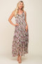 A one piece swimsuit. Features a scoop neckline, short ruffle layered sleeves, ruched sides, a cutout back with a tie and removable padding at the bust.