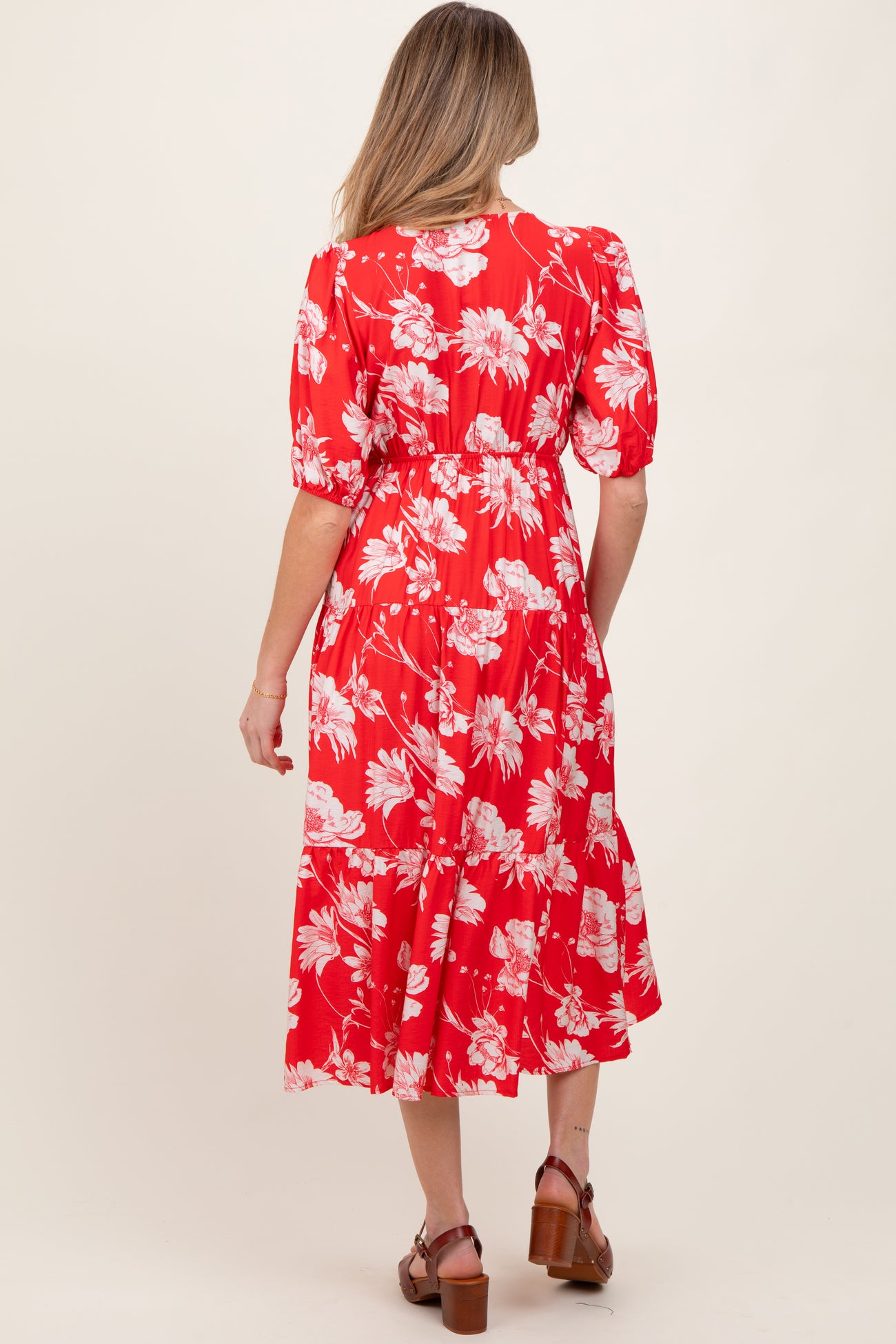 Red Floral Tie Front Tiered Maternity Midi Dress