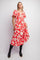 A printed midi dress with a tiered ruffle skirt, v-neckline, and flowy sleeves.