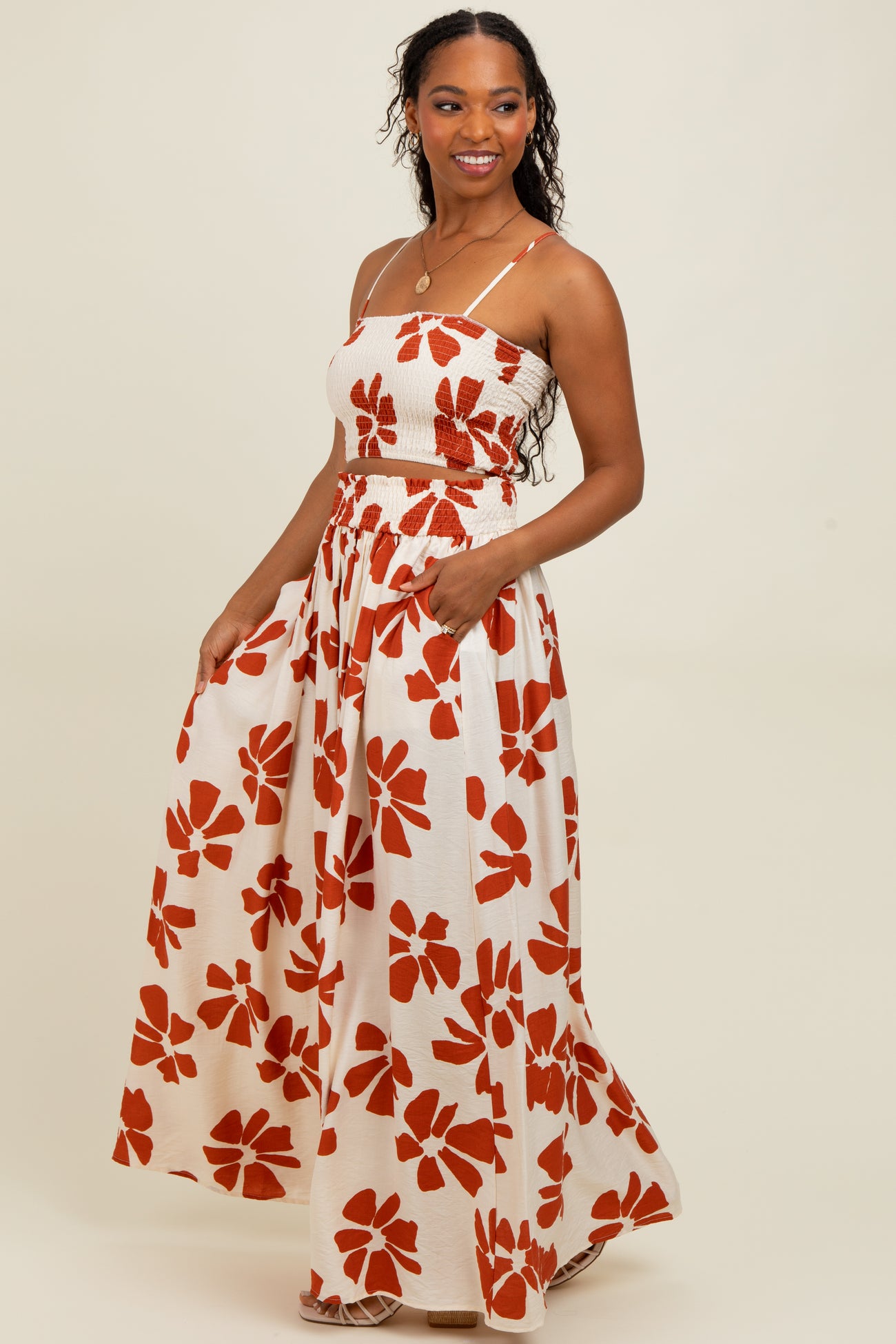 Embrace effortless boho-chic style with our Rust Floral Smocked Top & Maxi Skirt Set. This two-piece features a smocked crop top with adjustable spaghetti straps, ensuring a comfortable, flattering fit. The flowing maxi skirt boasts a smocked waistband and large rust floral prints on a creamy background, creating a stunning contrast that’s perfect for sunny days or casual evenings. Made from lightweight, breathable fabric, this set combines style and comfort effortlessly. Dress it up with wedges or keep it casual with sandals for a versatile look you’ll reach for all season long.