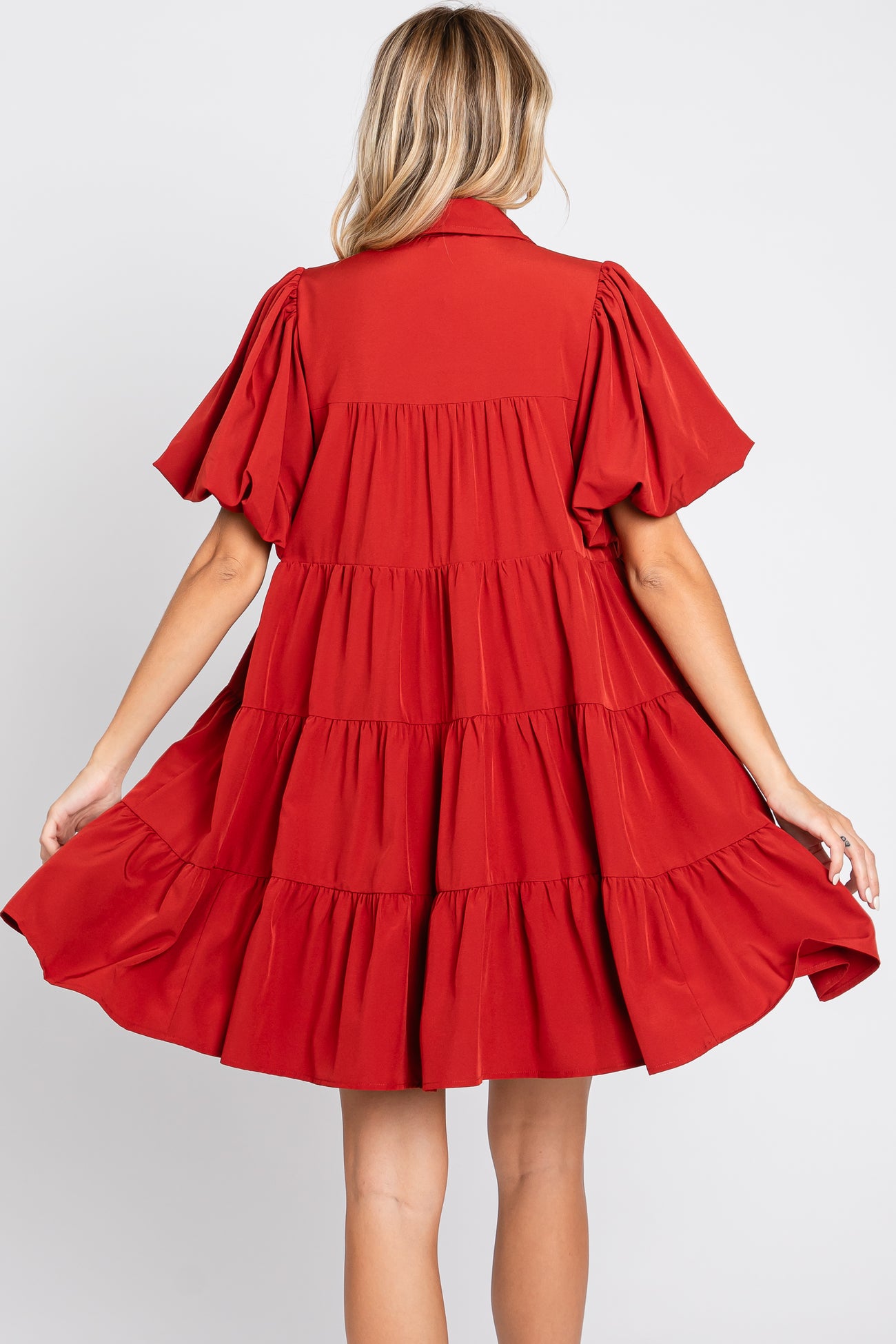 A solid shirt dress in a mini length. Features oversized puff sleeves and double lining.