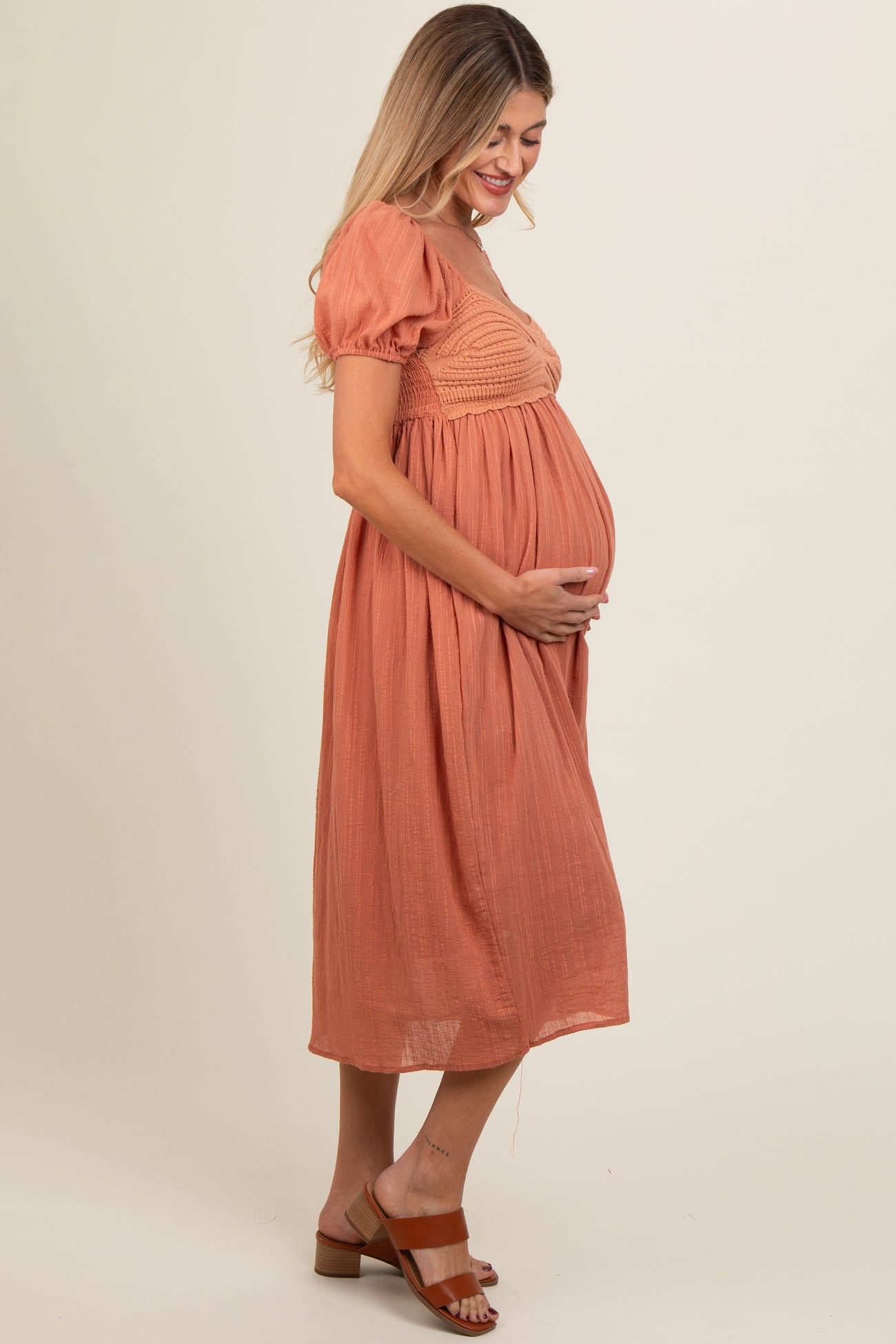 Salmon Crochet Front Short Puff Sleeve Maternity Midi Dress