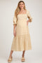 A satin maternity maxi dress featuring a square neckline, short puff sleeves, a smocked elastic back, a ruffle hem and double lined.