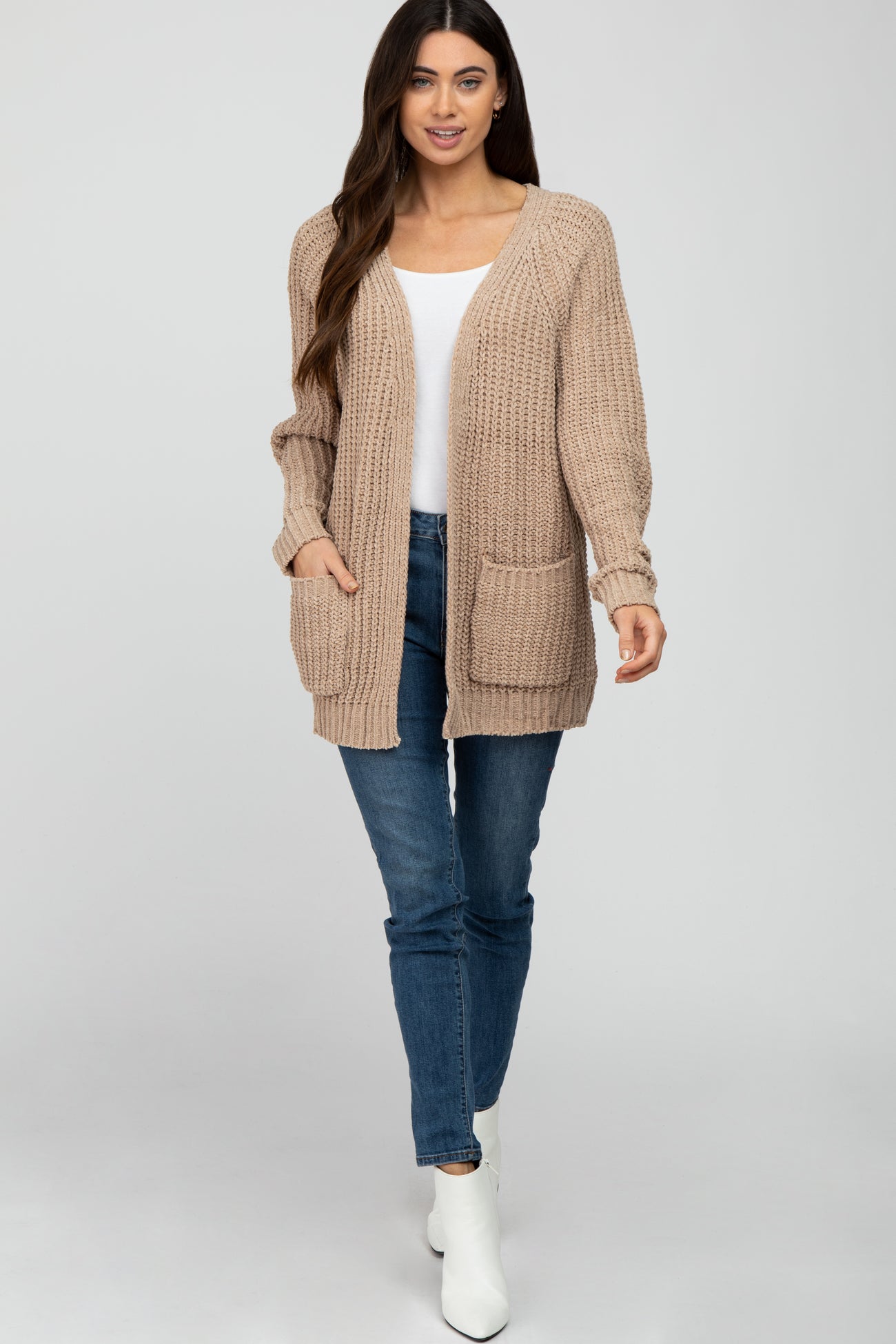 A soft cable knit cardigan featuring front pockets and long sleeves.