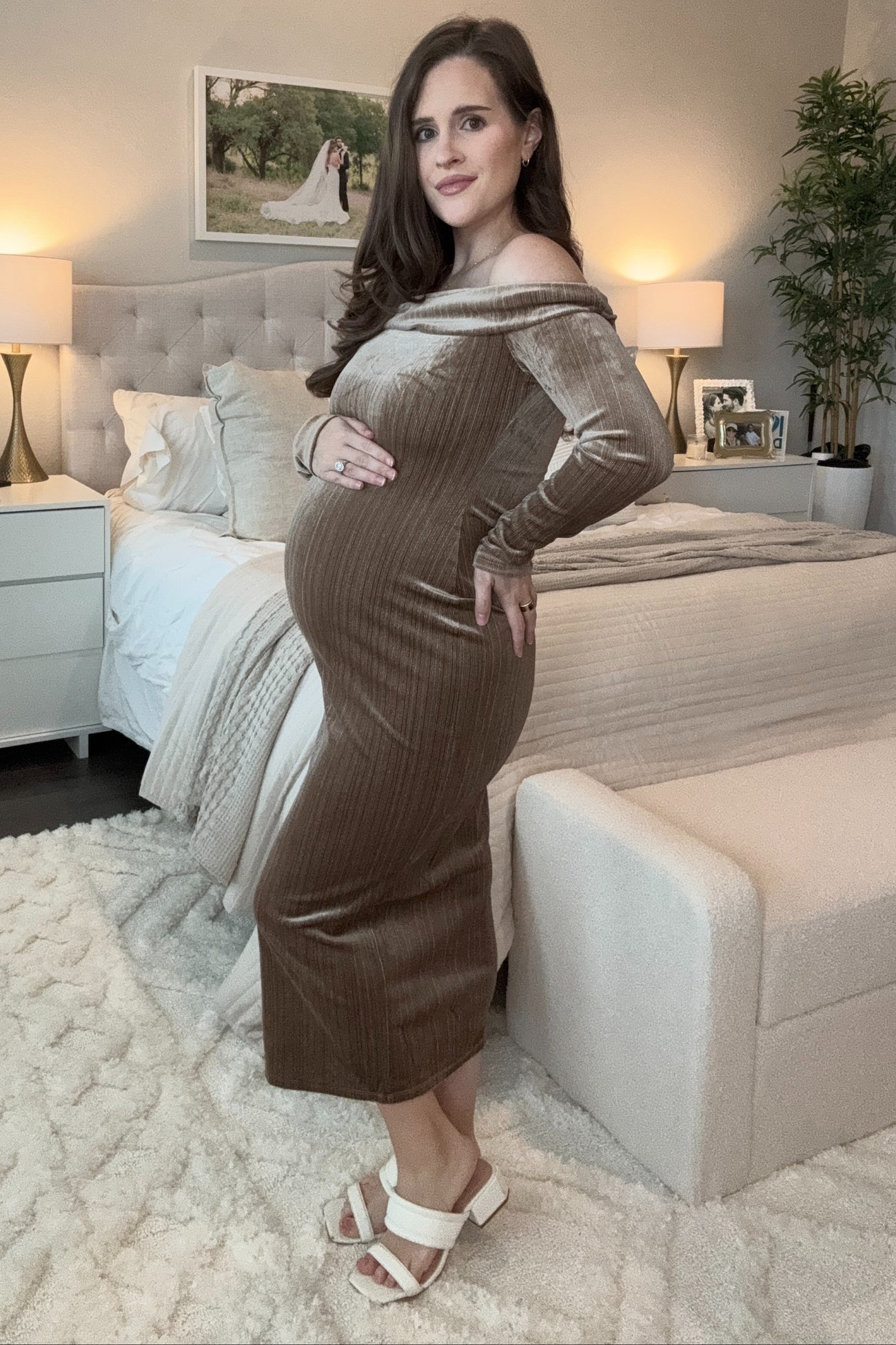 Elevate your maternity wardrobe with this Taupe Shiny Velour Off Shoulder Maternity Midi Dress. Crafted from soft, stretchy velour fabric, it gently hugs your growing bump while providing all-day comfort. The off-shoulder neckline adds a touch of elegance and femininity, perfect for special occasions or stylish everyday wear. Featuring long sleeves and a midi length, this dress balances sophistication with cozy warmth. Its shimmering taupe hue enhances your radiant glow, making it a versatile piece for any season. Pair with heels or flats for an effortlessly chic maternity look. Perfect for moms-to-be who want comfort without compromising on style!