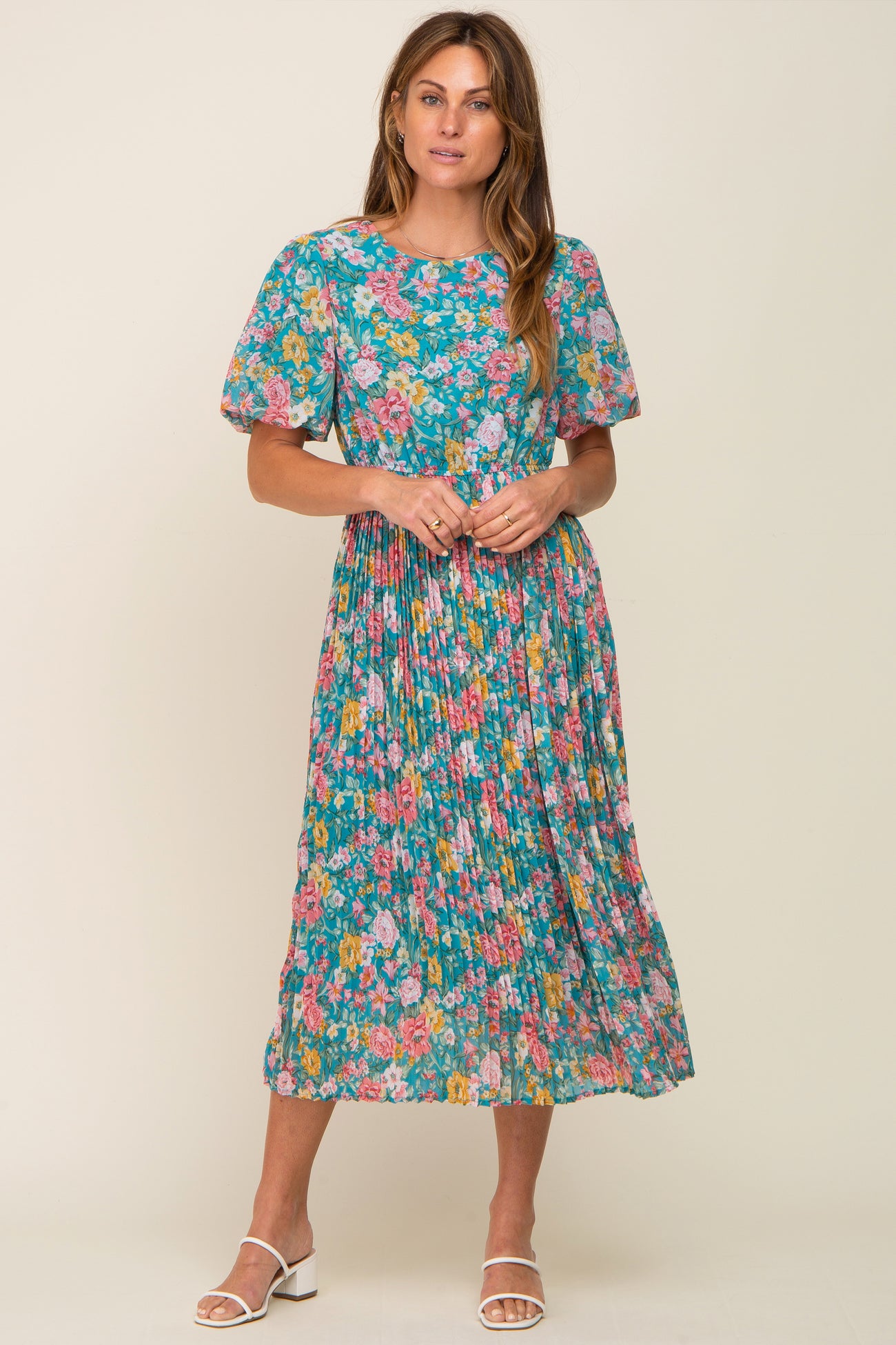 Teal Floral Chiffon Pleated Maternity Midi Dress