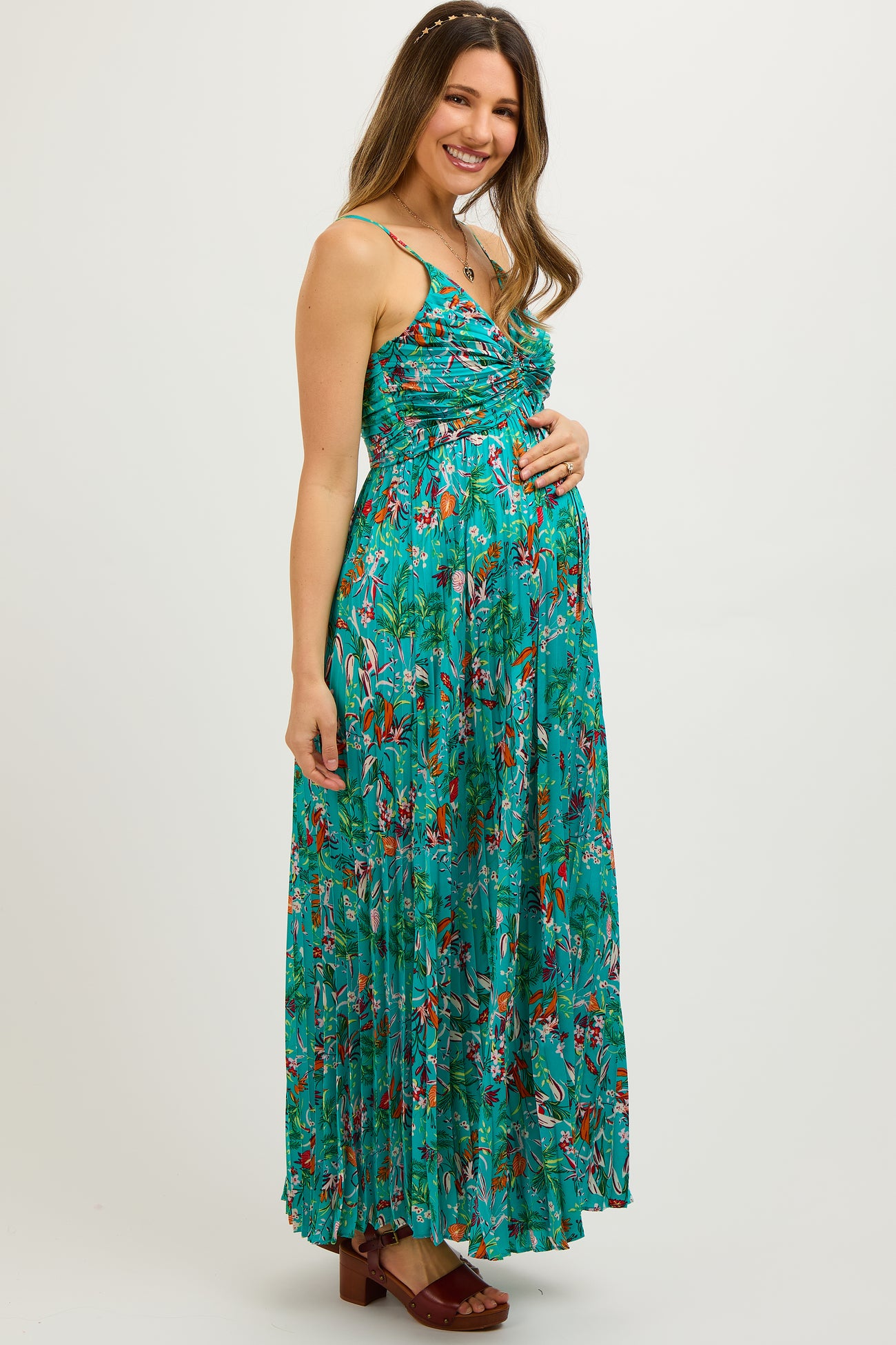 Teal Floral Pleated Ruched Front Maternity Midi Dress