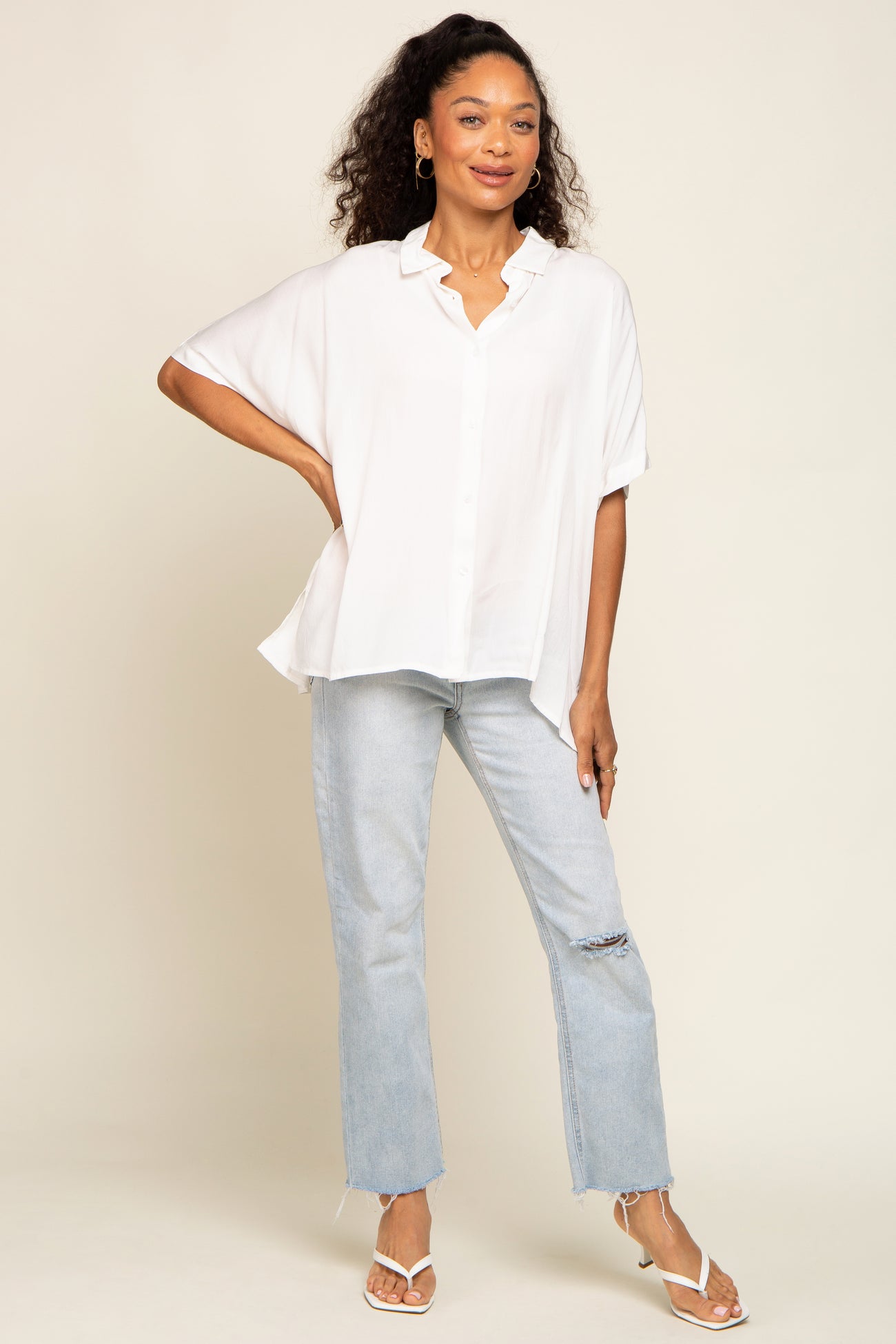 White Button Up Dolman Short Sleeve Top