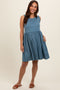 An iridescent maternity midi dress with a squared neckline, short textured puff sleeves, and a gathered bottom tier.