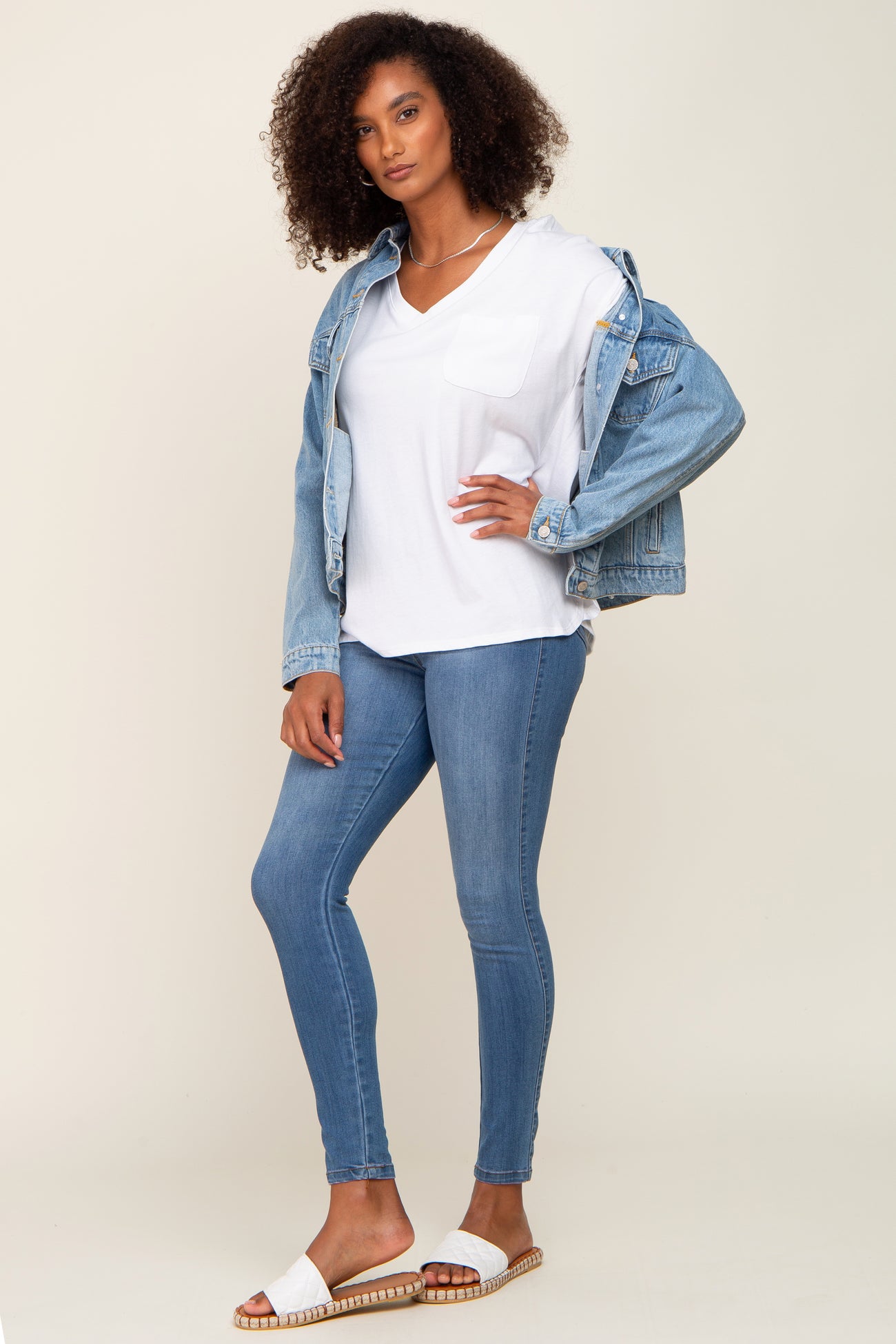 A solid top featuring a front pocket, short sleeves, a v-neckline and side slits.