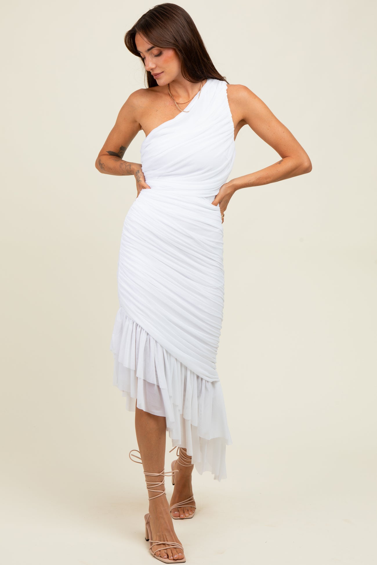 White Ruched Mesh One Shoulder Asymmetric Dress