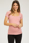 A solid hued maternity top featuring short sleeves and a rounded neckline.