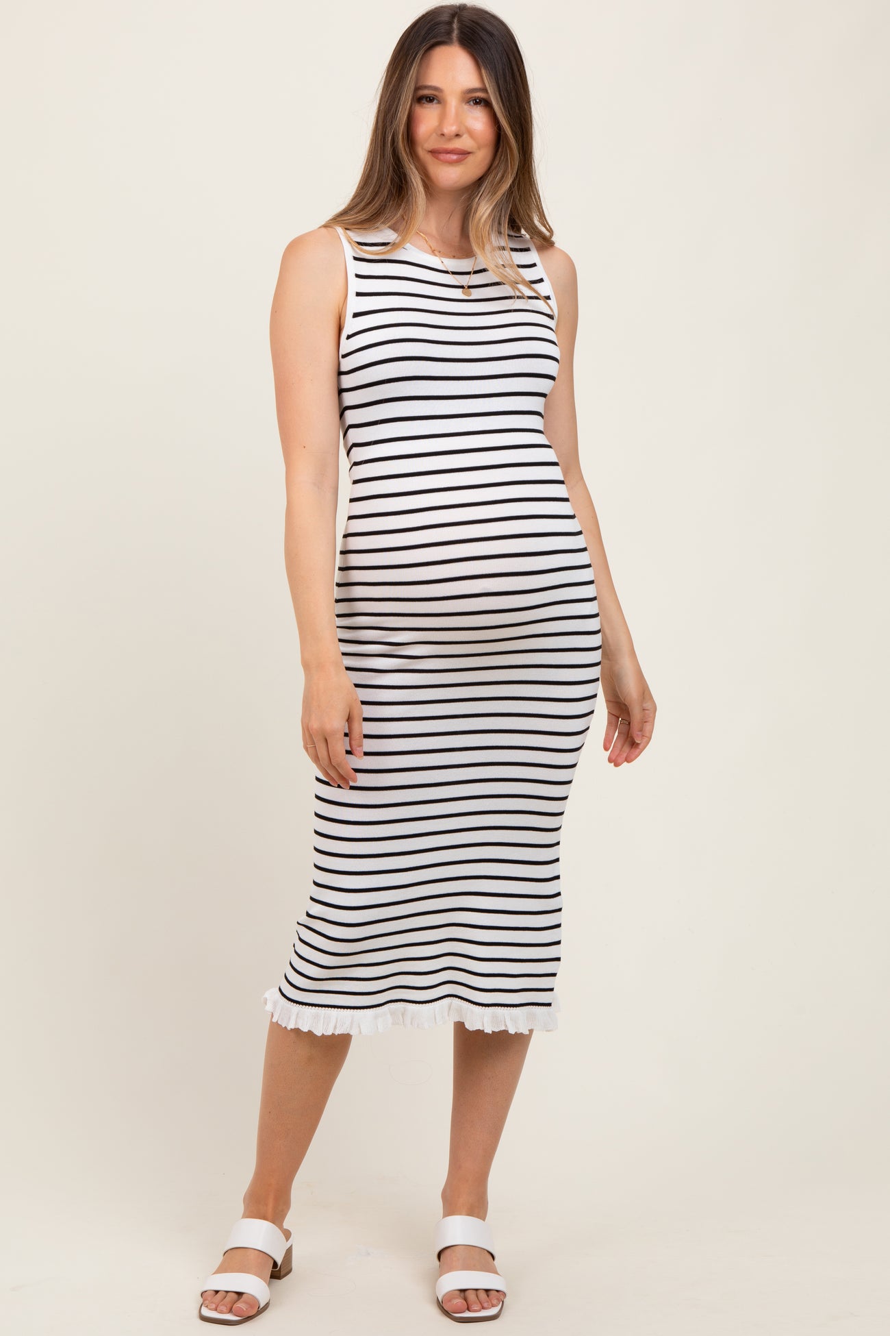 White Striped Knit Sleeveless Ruffle Hem Maternity Midi Dress
