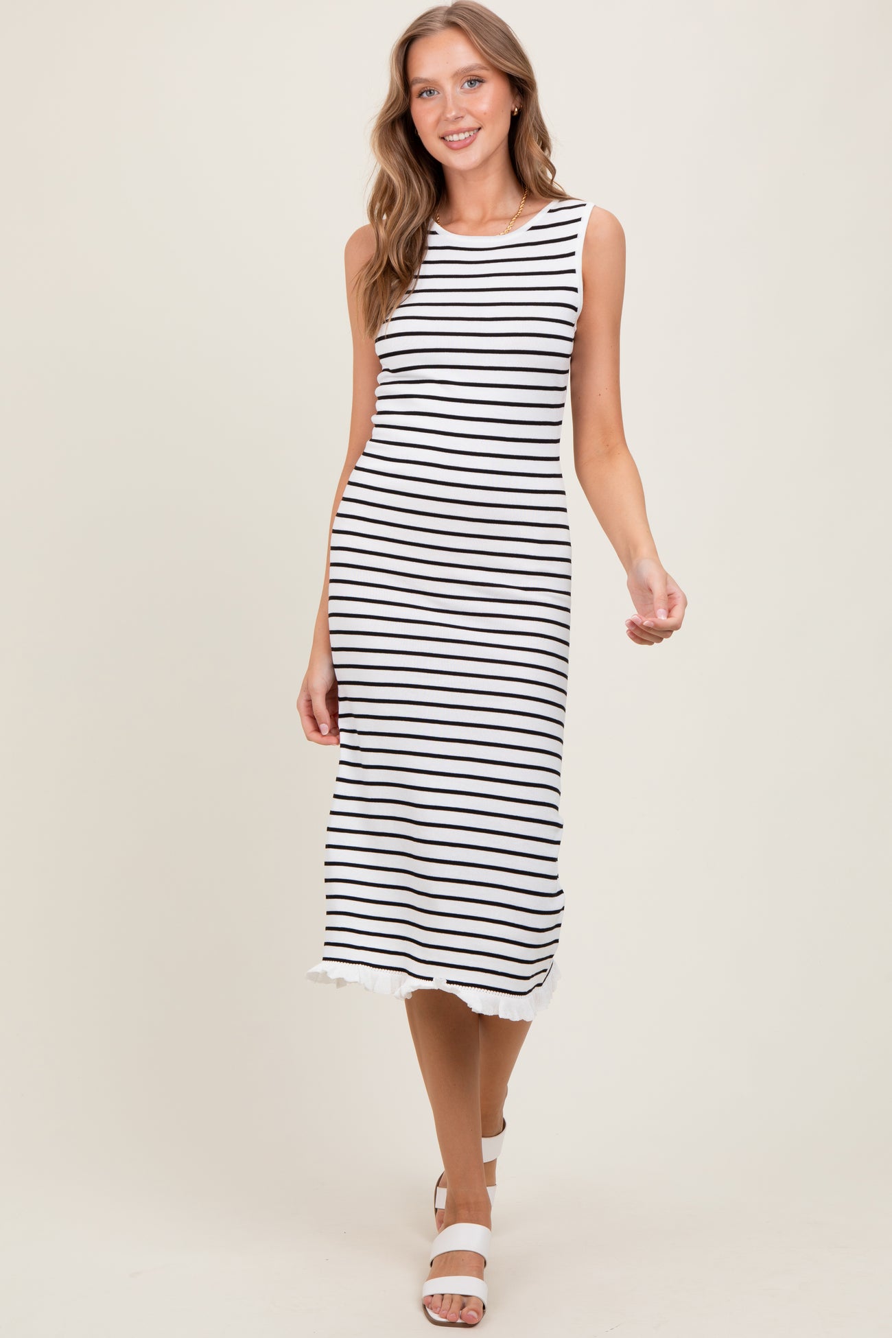 White Striped Knit Sleeveless Ruffle Hem Midi Dress