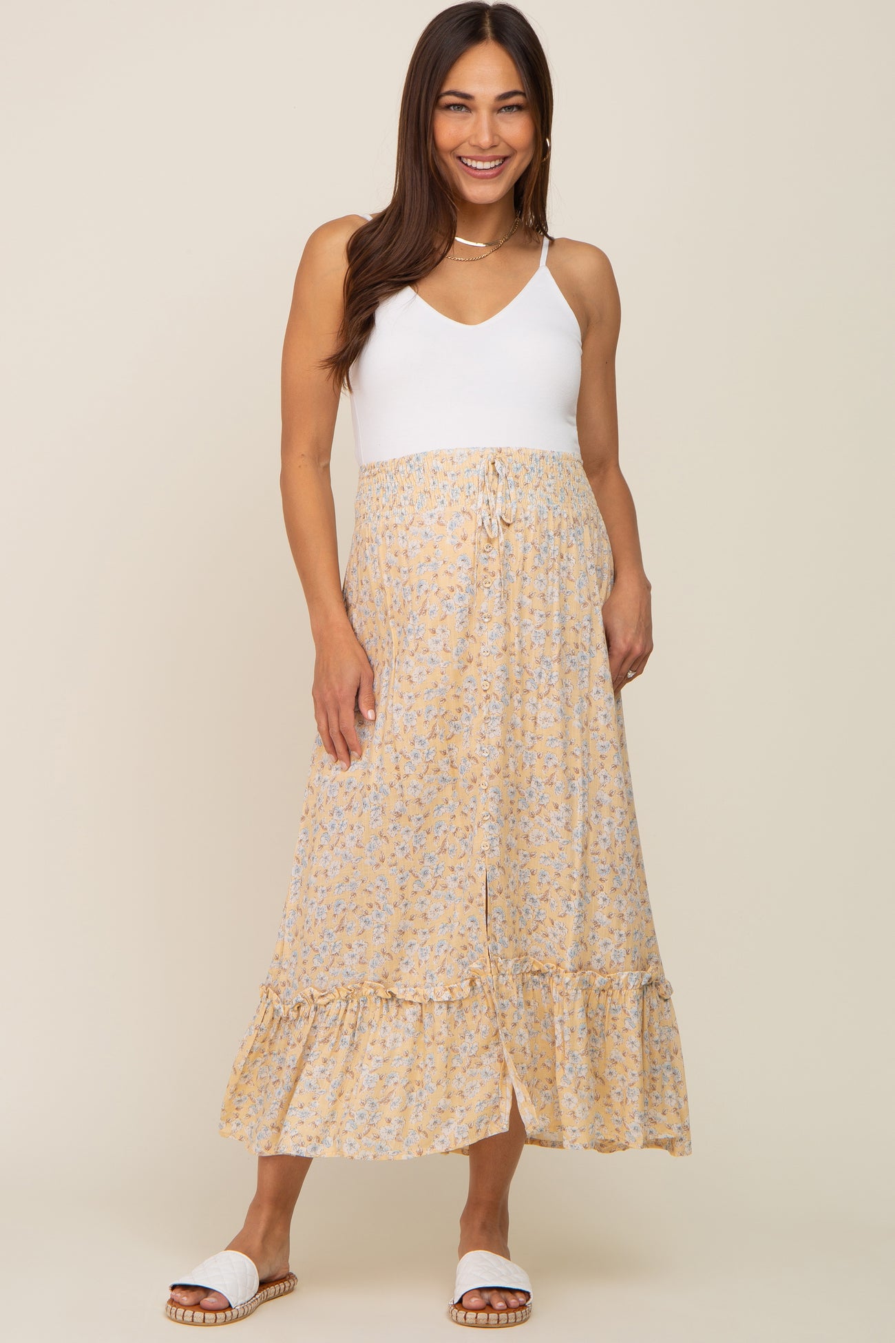 Yellow Floral Button Ruffle Maternity Maxi Skirt
