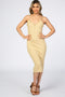 A striped, fitted maternity midi dress with ribbed material, a faux button front detail on neckline, ruffle neckline trim, v-neckline, adjustable cami straps.