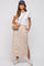 A midi skirt featuring four pockets including two side cargo pockets, adjustable drawstring cinched sides, side slits, and a front zipper and button closure.
