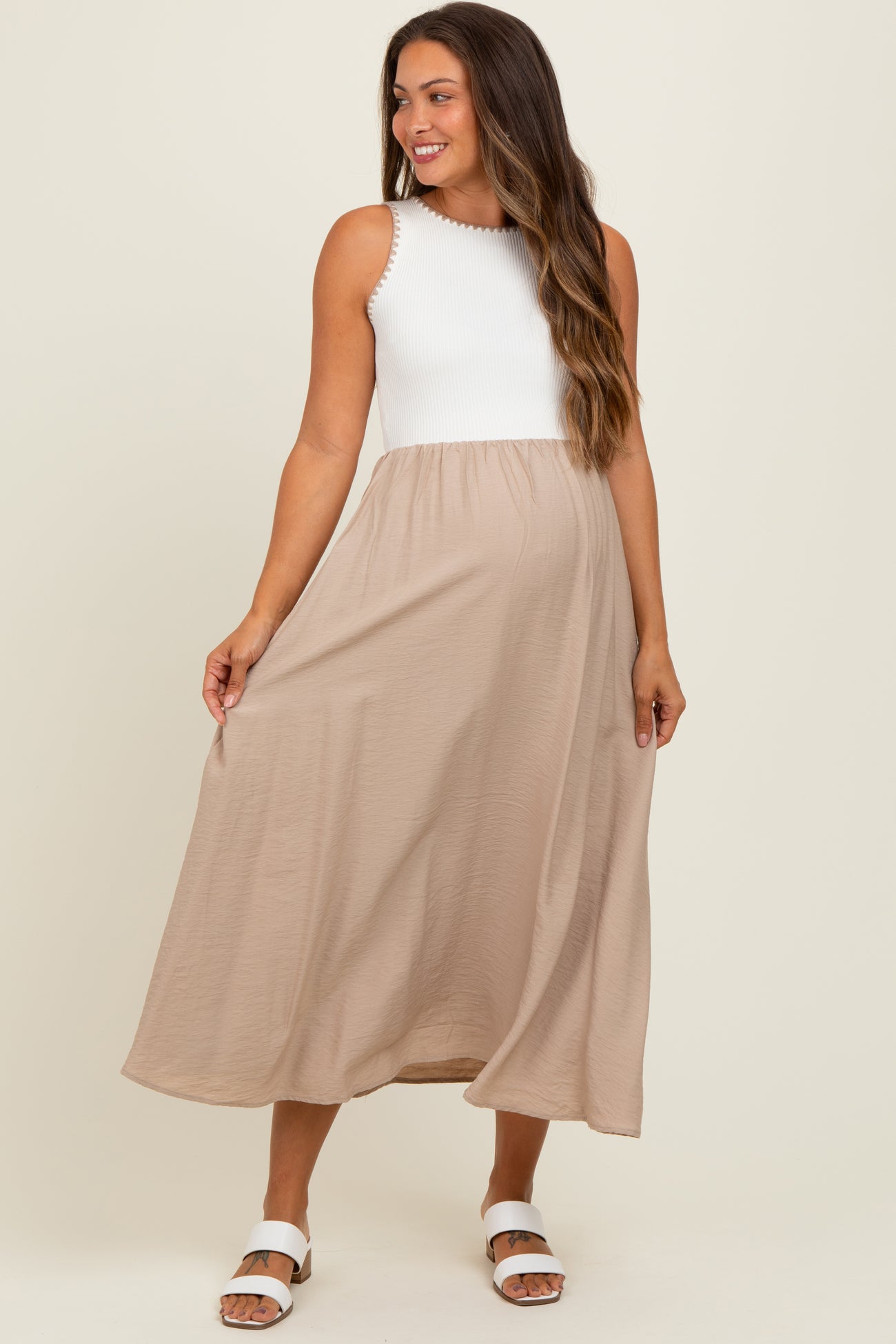 Beige Contrast Knit Top Sleeveless Maternity Midi Dress