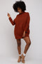 A corduroy romper with front functioning buttons, a collar, long drop shoulder sleeves, front pockets, and a cuffed hem.