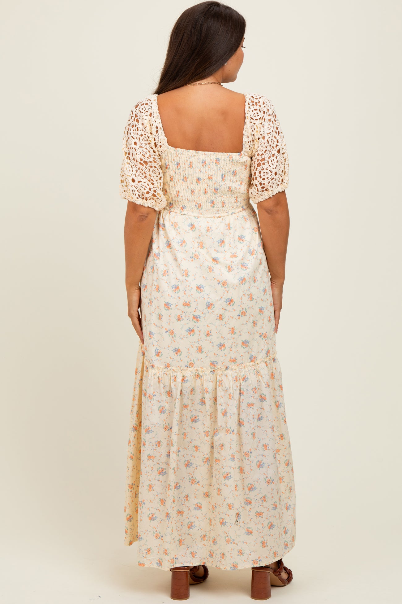 Beige Floral Print Smocked Crochet Tiered Maternity Maxi Dress