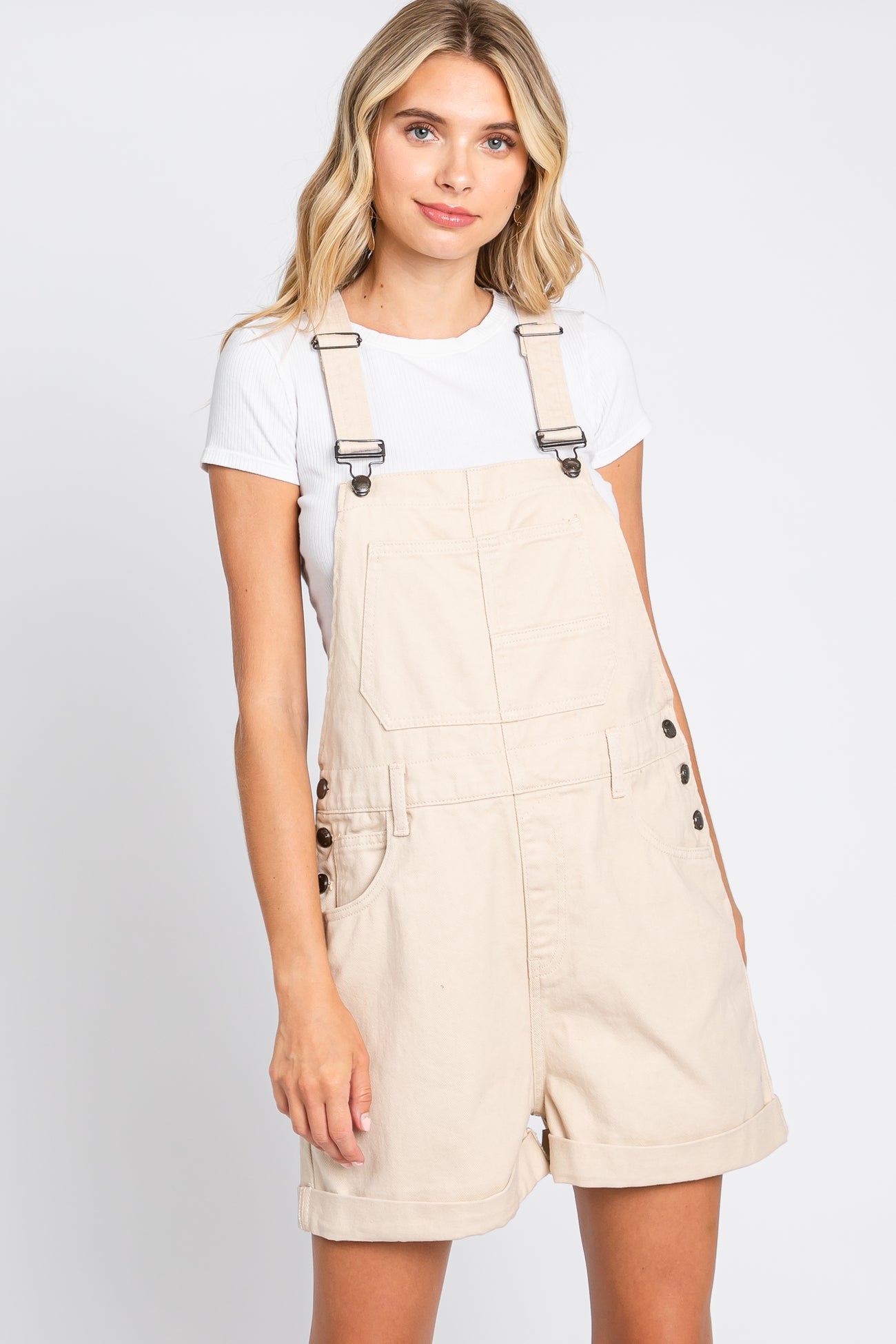 Details A maternity overall with cuffed shorts, a front pocket, side pockets, side buttons, and adjustable straps. Content + Care