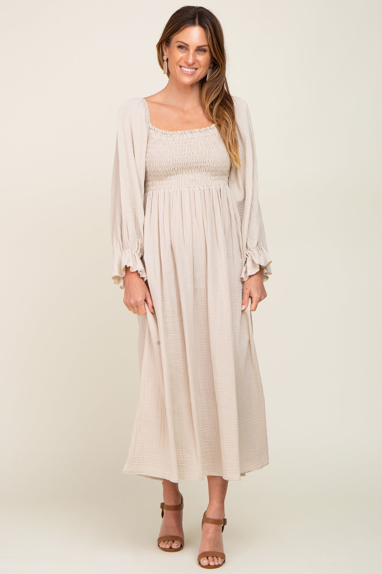 Details A lightweight maternity midi dress with a squared neckline, long cinched sleeves, and a smocked top. Content + Care