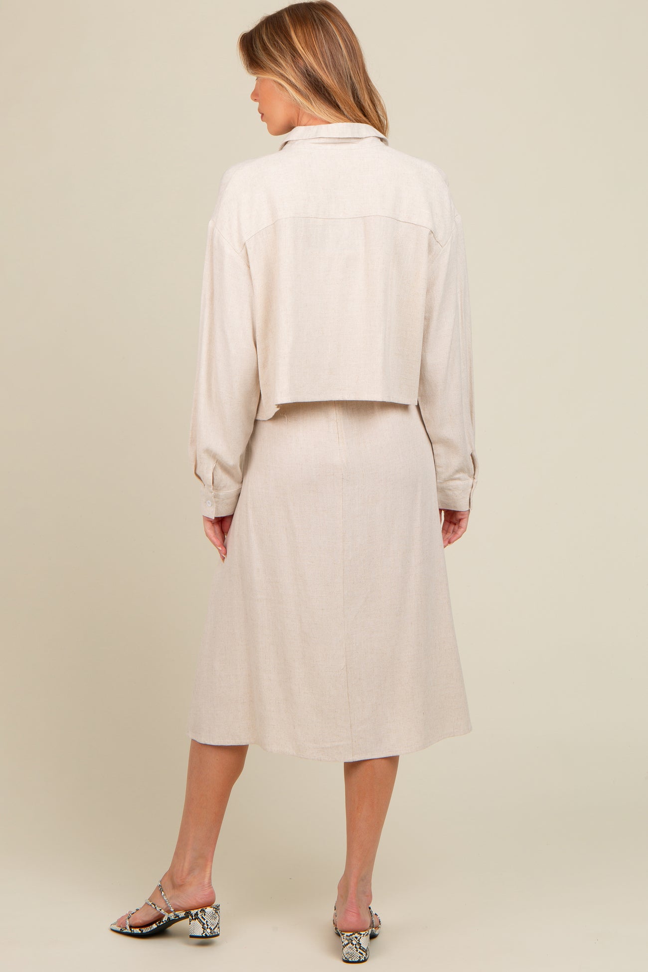 Beige Linen Cropped Shirt Midi Dress Maternity Set