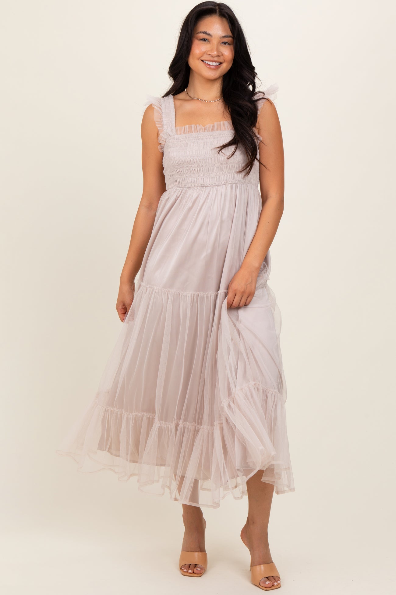 Beige Mesh Overlay Smocked Maternity Midi Dress
