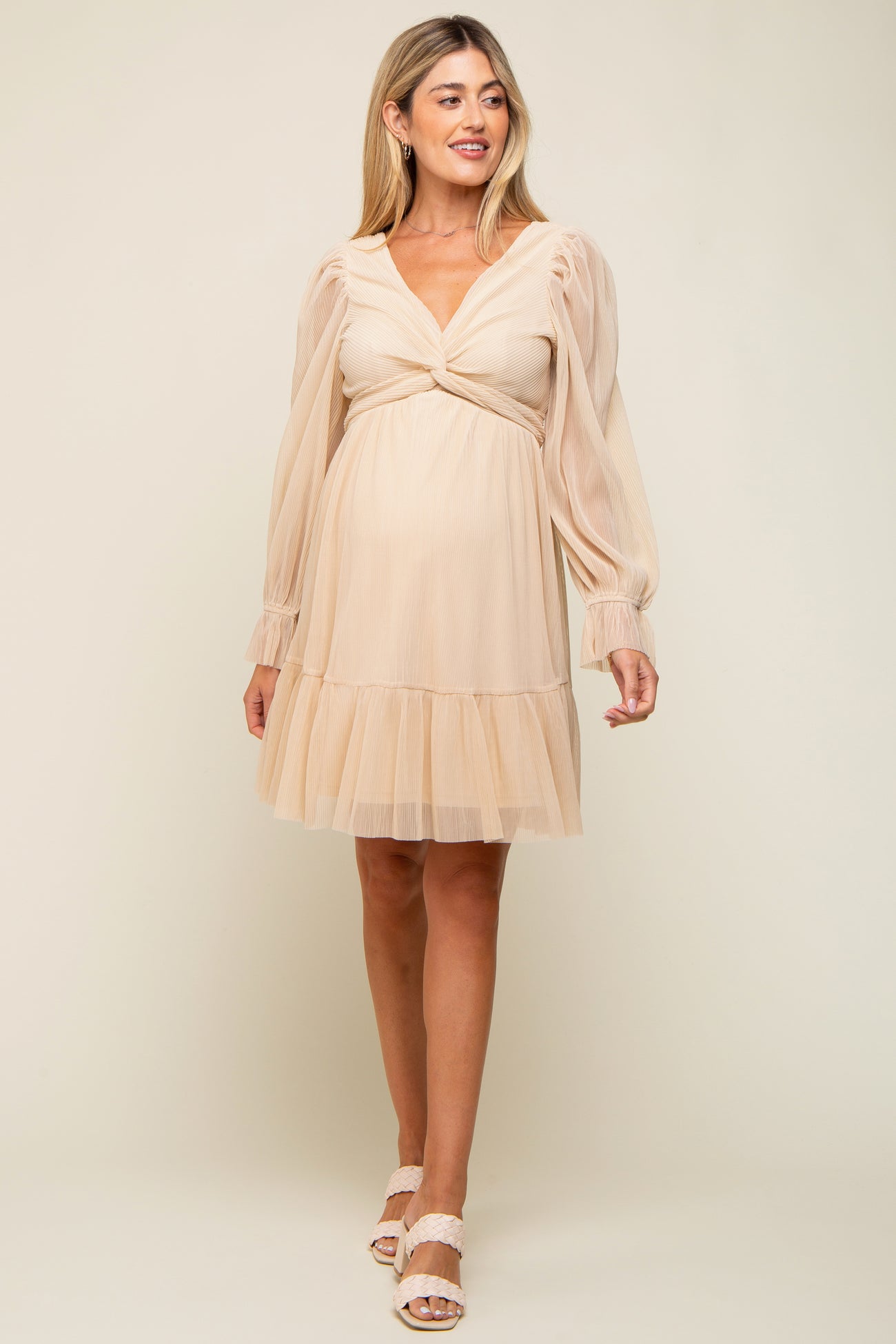 Beige Pleated Knotted Long Sleeve Maternity Dress