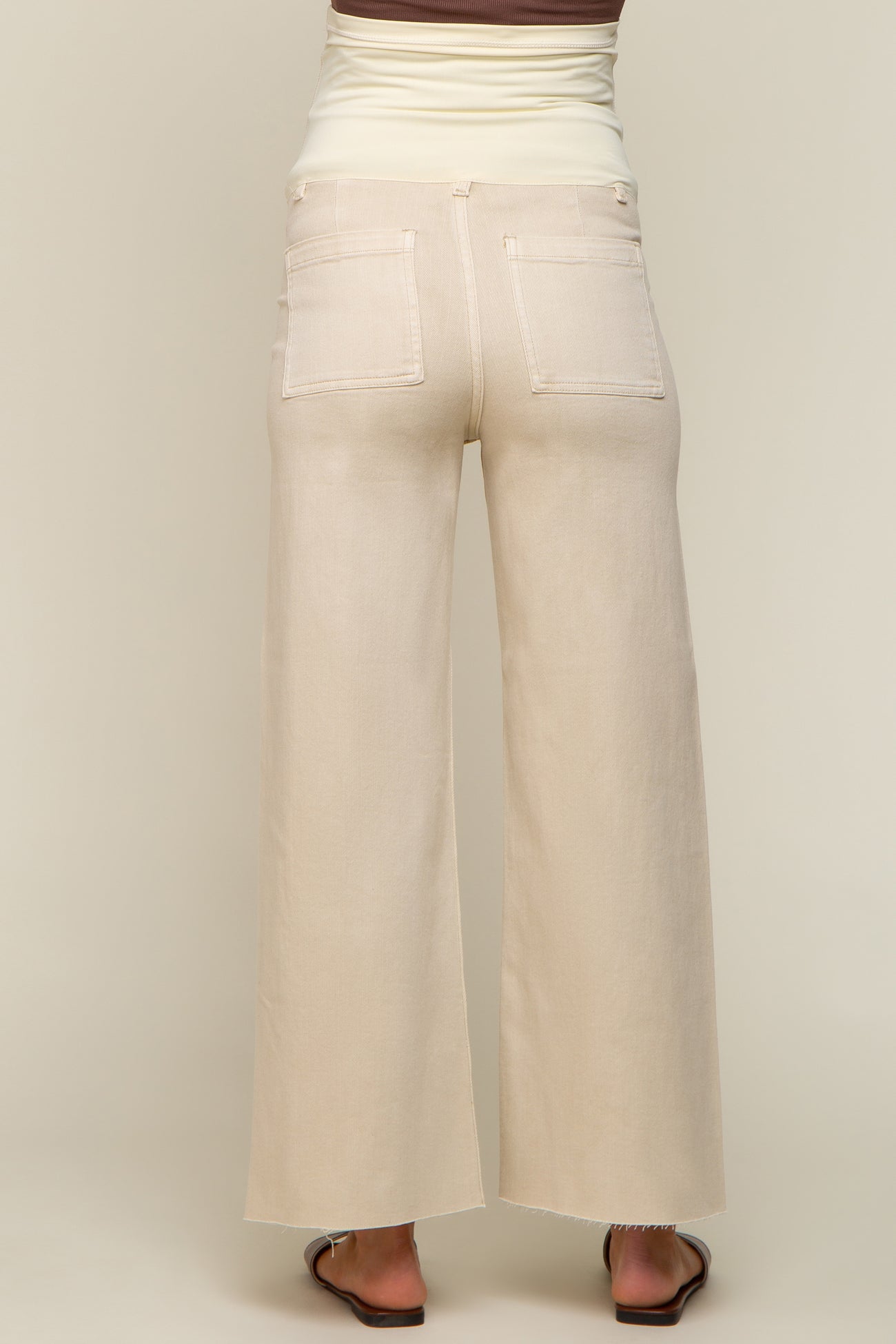 A pair of maternity jeans with a relaxed wide leg fit and raw hem. Includes full panel elastic bellyband, back pockets, and little stretch.