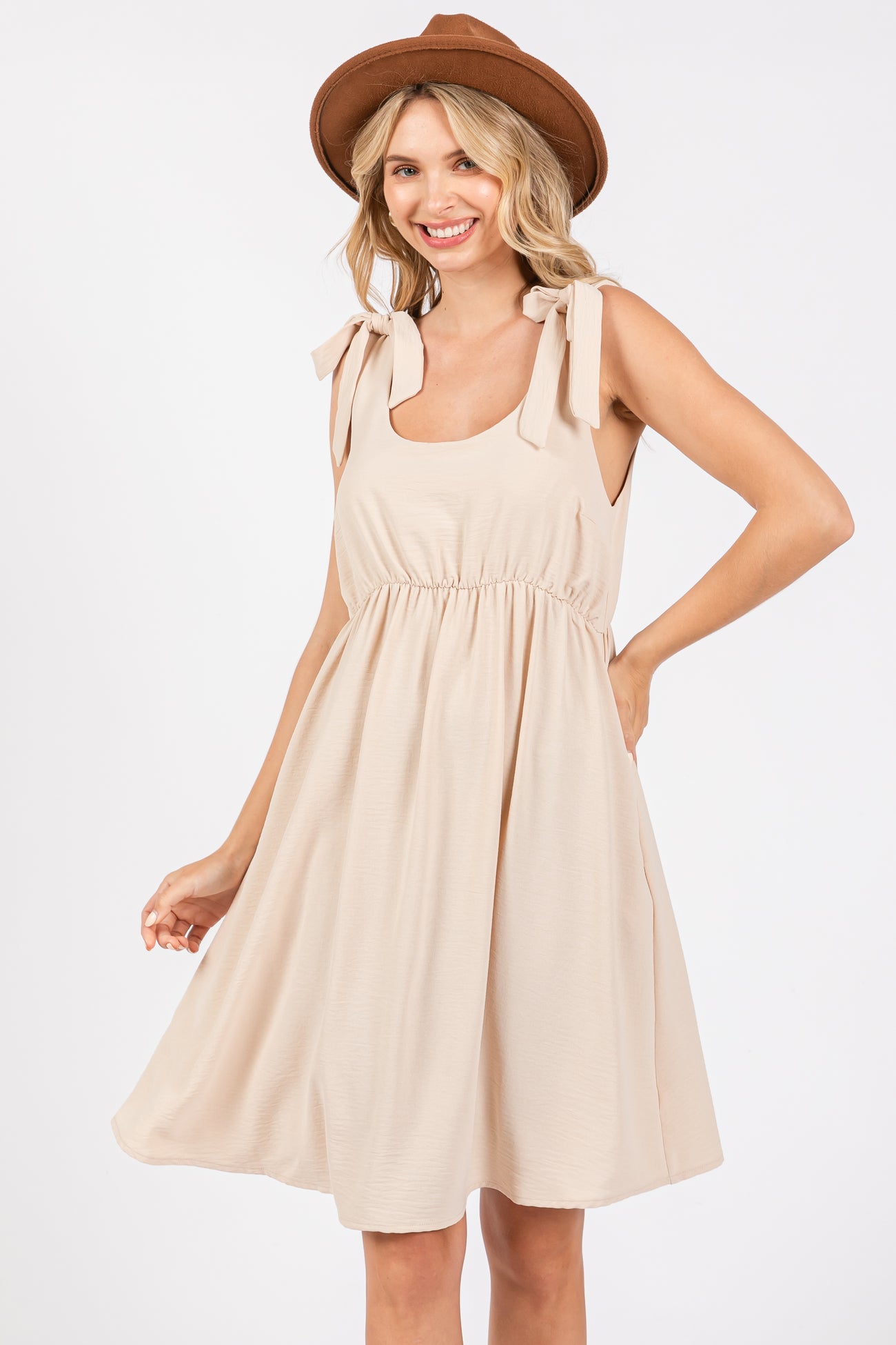 Beige Solid Tie-Shoulder Scoop Neck Dress