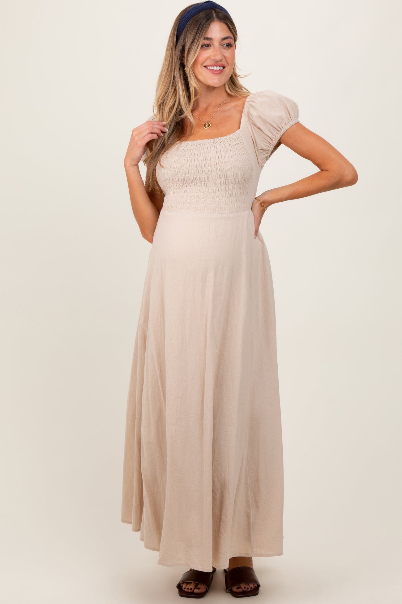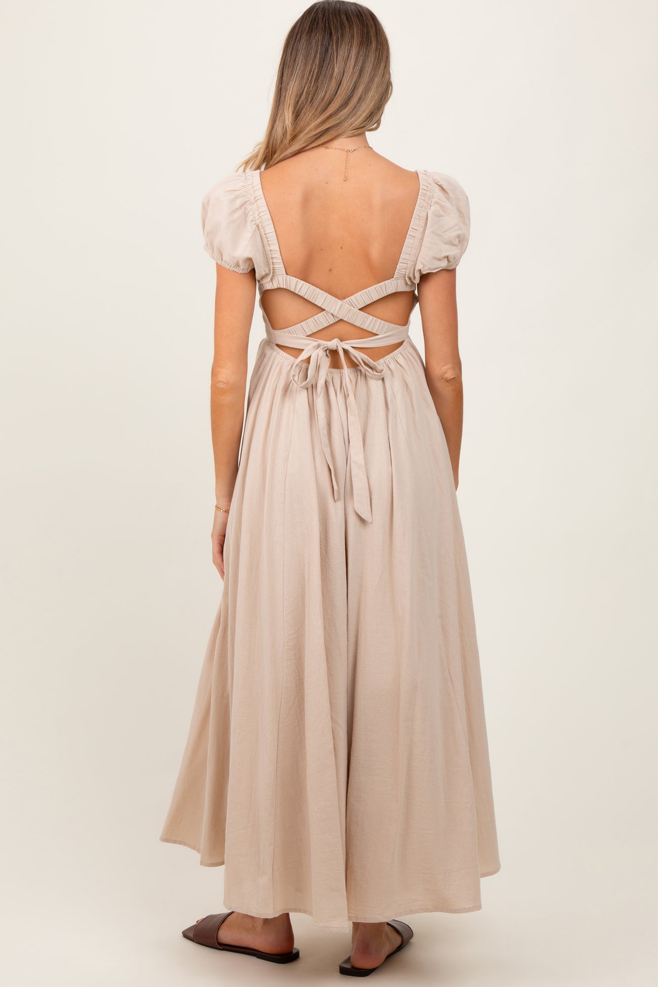 Beige Square Neck Smocked Top Criss Cross Back Tie Maternity Maxi Dress
